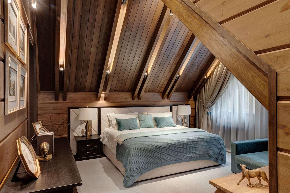- По сравнению со стандартной прямоугольной коробкой аналогичных габаритов полезная площадь помещения со скошенными стенами будет меньше. Наклон кровли в любом случае «съедает» часть пространства возле стен. Поэтому обычную мебель трудно разместить компактно.
