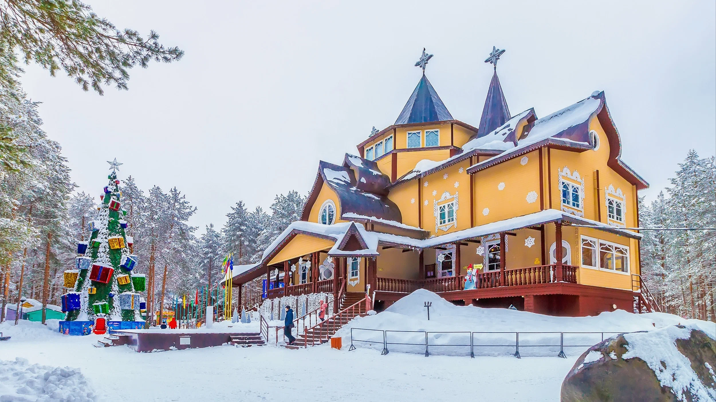 Вотчина Деда Мороза в Великом Устюге — старинный брусовый терем в два этажа, с резным декором и росписью в русском стиле.