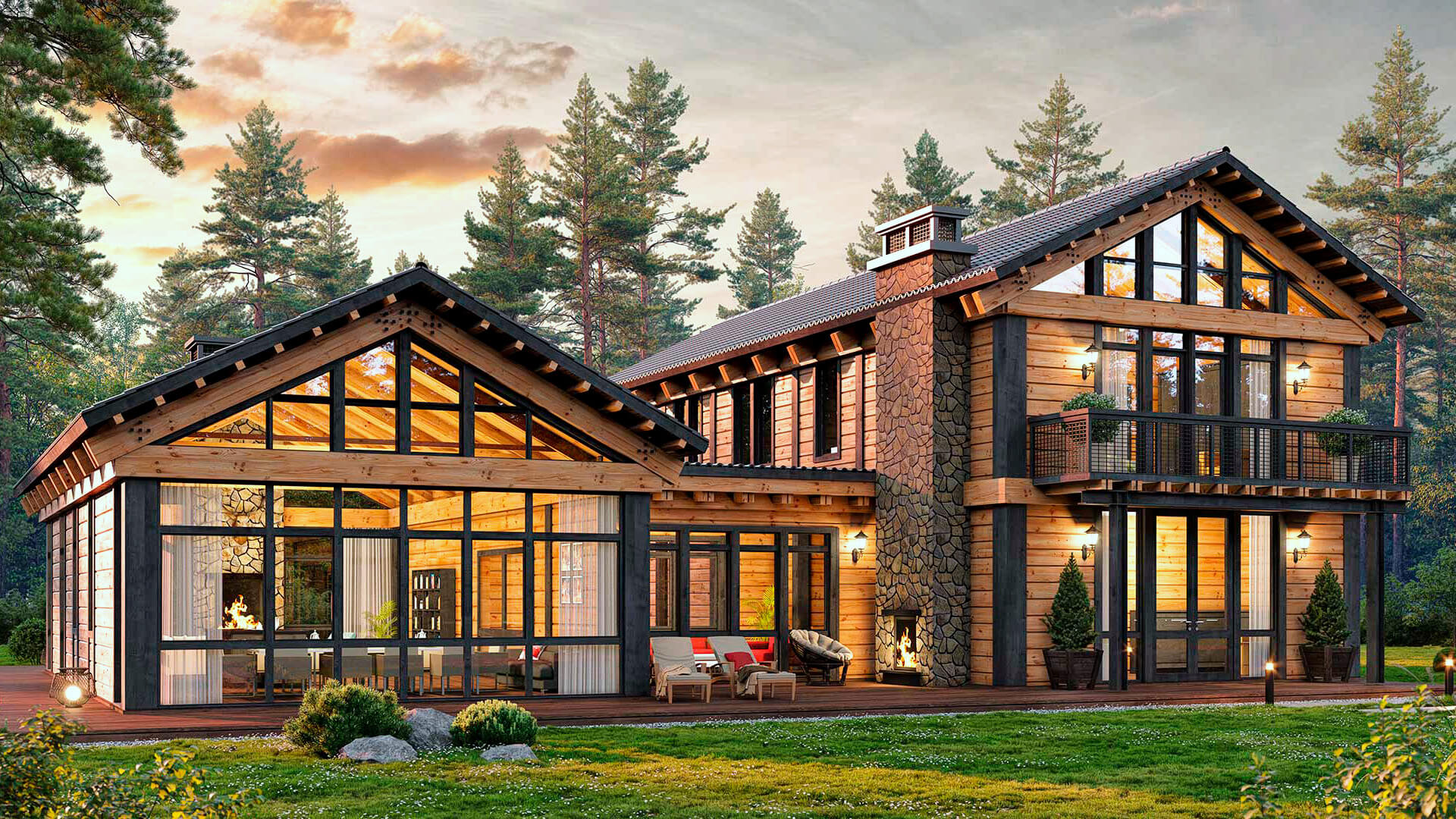 - Применение новых стилей в интерьере и отделке фасада. Такие направления как хай-тек, эко, барнхаус, минимализм удачно сочетаются с материалами из дерева и панорамным остеклением. Проекты предусматривают обширные внутренние пространства за счет отсутствия перегородок и использования принципов свободного зонирования площади. В экстерьере ценится простота, минимализм в декоре. Цветовая палитра — спокойные, даже немного, холодные тона. Интерьер — сочетание практичности и комфорта.