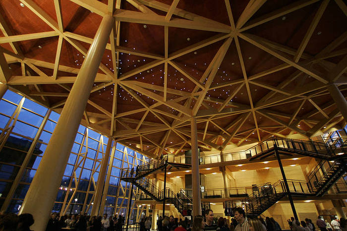 Зал заседаний ПАСЕ (Франция, Страсбург). Элементы арочного свода изготовлены из клееного бруса. Нестандартной формы конструкция выглядит оригинально, при этом характеристики стройматериала делают ее достаточно прочной и надежной.