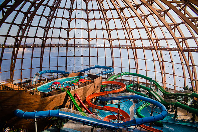 Аквапарк «Питерлэнд» (Санкт-Петербург). Купольная конструкция высотой 45 метров выполнена из бруса.