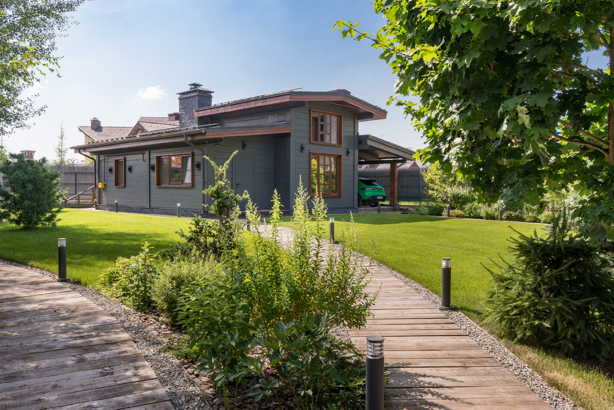 Лесные массивы, в свою очередь, обеспечивают уединение и акустический комфорт, а их густая зелень, видимая через панорамные окна, становится естественным продолжением внутреннего пространства дома.