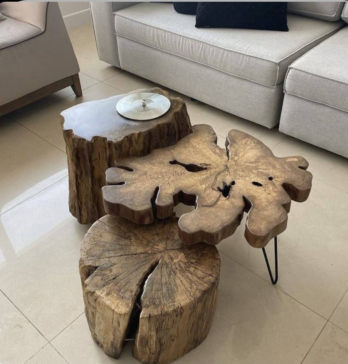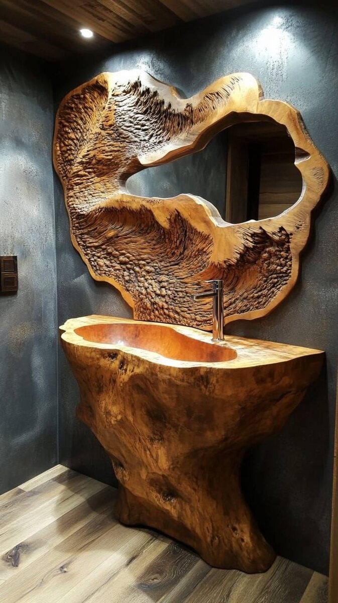 Дерево в этом случае выступает в качестве основного материала. Благодаря таким способам обработки, как ручная рубка, браширование, резьба и шлифовка, удаётся в полной мере раскрыть его естественную красоту и подчеркнуть уникальную текстуру. Использование масла вместо лака позволяет сохранить ощущение живого материала, его естественную тактильность. В результате получаются изящные лестницы с затейливо оформленными балясинами, столешницы с неровными, «живыми» краями, оригинальные консоли, созданные из коряг, а также массивная мебель, которая словно хранит в себе историю прошлых времён.