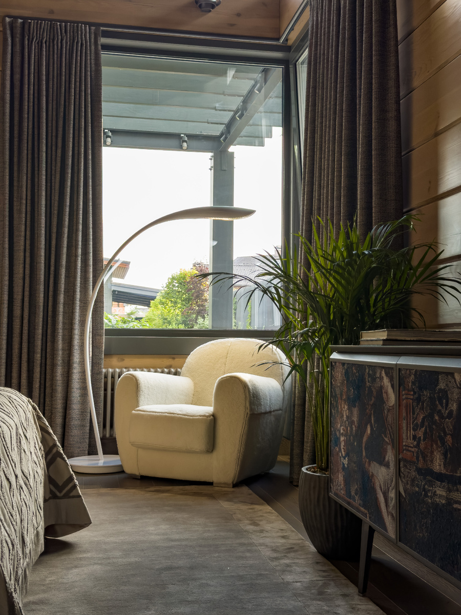 Но древесина — лишь часть картины. Центральное место в создании атмосферы уюта занимает текстиль. Здесь важно разнообразие текстур и слоёв: объёмный плед из шерсти с рельефным узором, бархатистое покрывало из вельвета, ковёр с густым ворсом, манящий погрузиться в него ногами, и множество подушек, выполненных из льна, бархата и вязаного мохера. Дополните картину плотными шторами из льна — и ощущение защищённого от внешнего мира уголка станет практически полным.