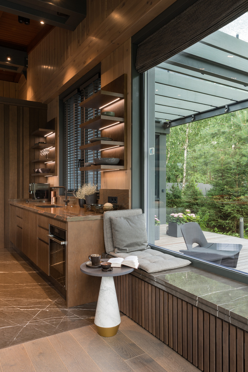 Можно выделить в своём доме особую «аналоговую зону», свободную от гаджетов, где царит атмосфера живого общения и где приятно читать бумажные книги. Архитектура здесь выступает верным помощником: просторные террасы становятся идеальным местом для спокойных семейных обедов, а зона с камином, отделанная натуральной древесиной и грубым камнем, дарит уникальные сенсорные впечатления.